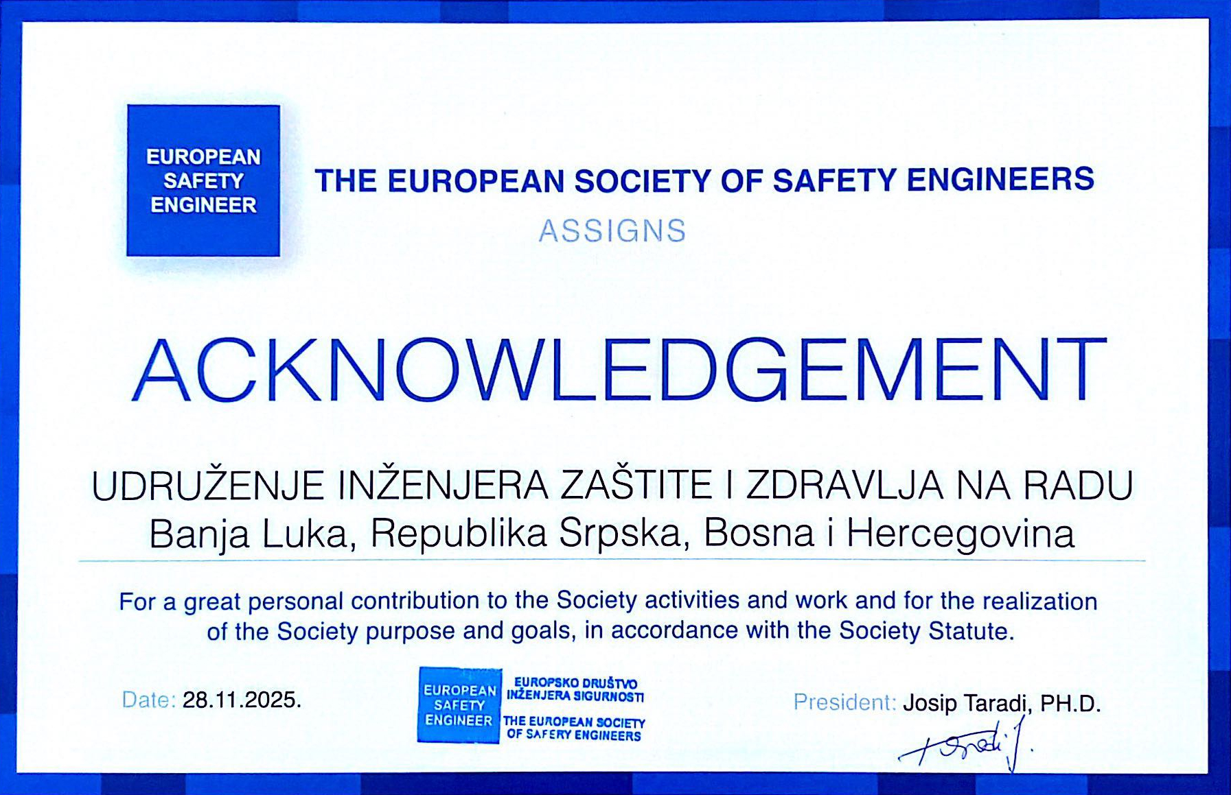 Europsko društvo inženjera sigurnosti (The European Society of Safety Engineers) je 28. novembra 2025. godine dodijelilo službeno priznanje "Udruženju inženjera zaštite i zdravlja na radu" sa sjedištem u Banjoj Luci. Ovo priznanje, koje je